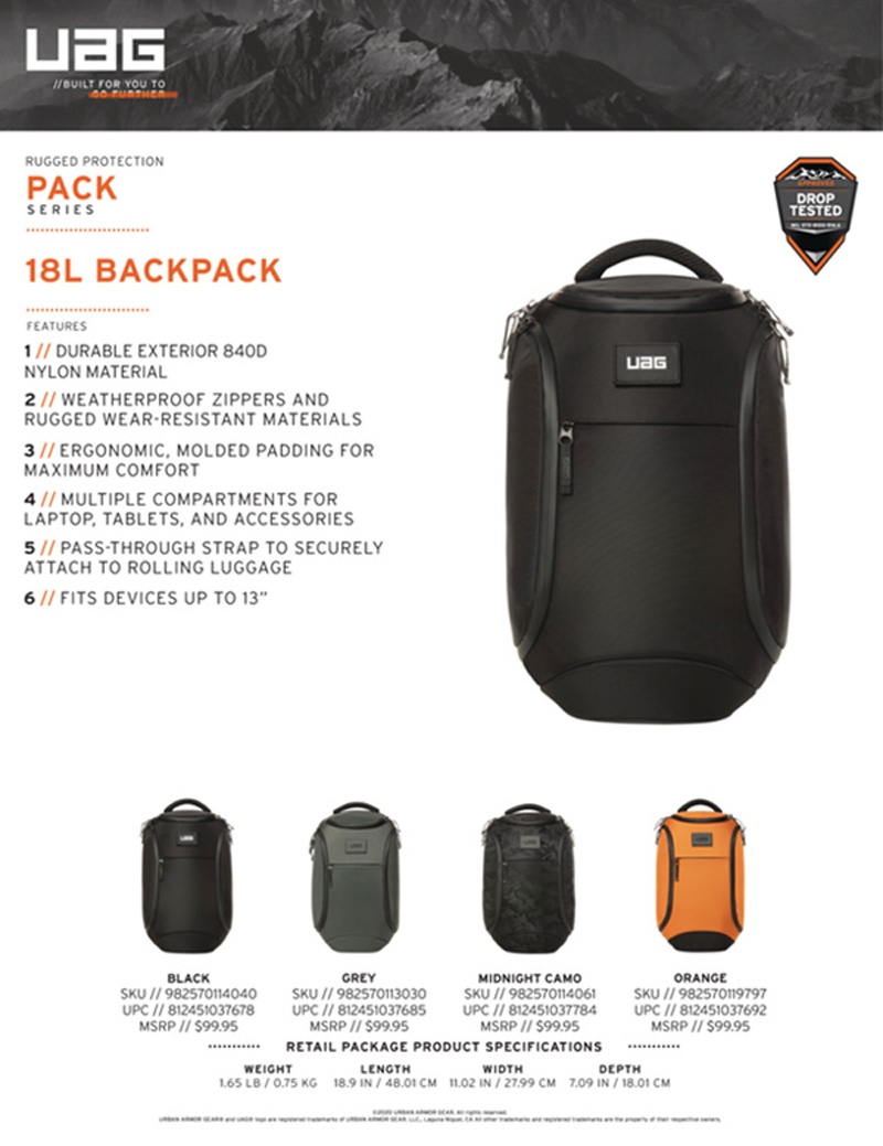 Balo chống sốc chống nước UAG STD Issue 18 Lít có đầy đủ chỗ cho đồ nghề của bạn. Với nhiều ngăn ở các điểm dễ lấy khác nhau, dây đeo trước ngực và thiết kế tiện dụng. Rất thích hợp cho các chiến binh phượt thủ cuối tuần và những người thường xuyên đi du lịch.