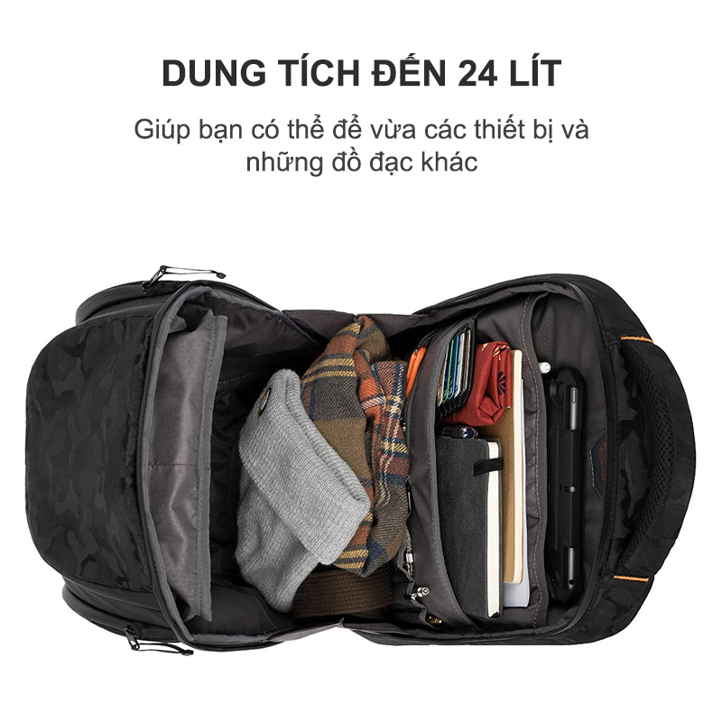 Balo có khoang chứa lớn – thể tích lên đến 24 (L) gồm có 1 ngăn chính lớn, 2 túi bên trong để máy tính xách tay, tập sách, quần áo, thiết bị điện tử và các vật dụng cá nhân cần thiết khác để sử dụng hàng ngày hay những chuyến du lịch ngắn ngày. Balo còn có 3 ngăn nhỏ bên ngoài, 2 ngăn bên trái phải và 1 ngăn ở trên để bạn có thể để nước, sổ tay, bút bi và đồ dùng nhỏ gọn khác. Đặc biệt, balo còn có ngăn bên hông dành riêng cho laptop, đã được gia cố thêm các lớp đệm chống sốc, bảo vệ an toàn cho laptop của bạn.