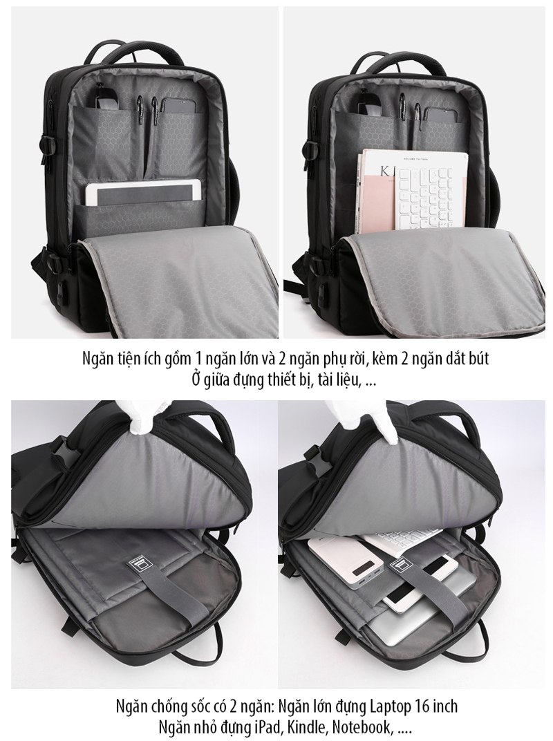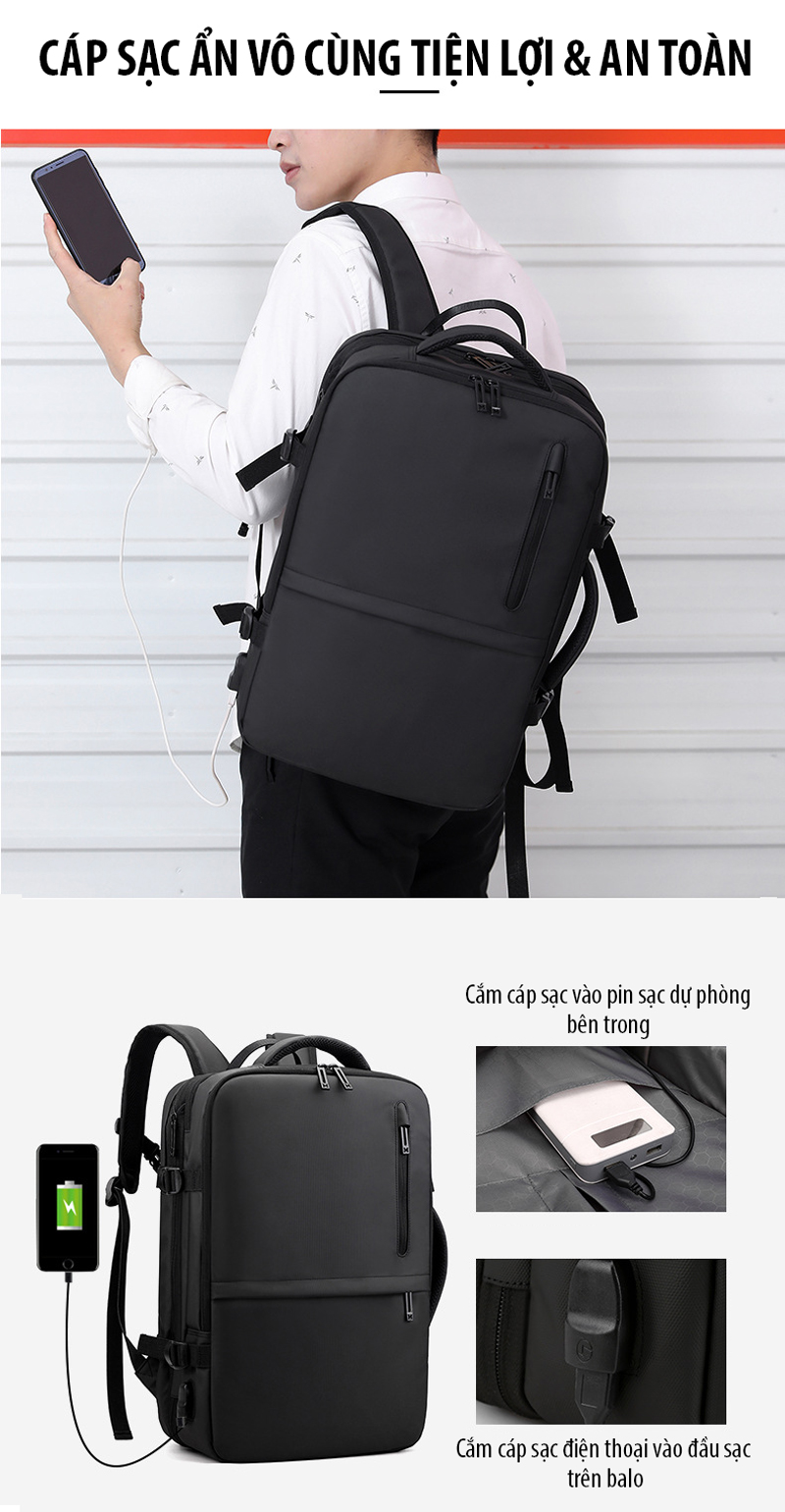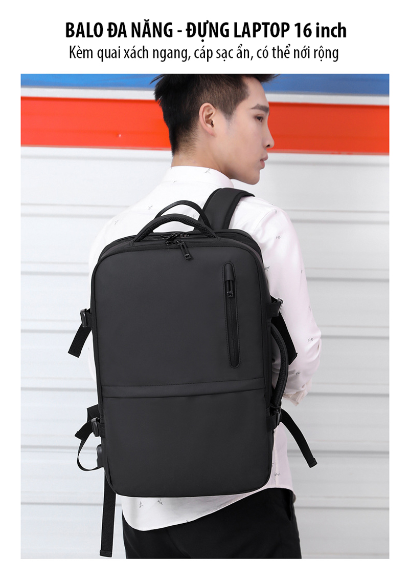 Balo du lịch đa năng đựng được Laptop 16 inch giúp mang theo bên mình để làm việc, đi học, ... hay những chuyến đi ngắn ngày bởi thiết kế rất nhiều ngăn, mở ngang như 1 vali, cáp sạc ẩn an toàn, đặc biệt là có thể nới rộng/thu lại đến 10cm hỗ trợ mang nhiều đồ vật hơn nhưng lại rất gọn gàng.