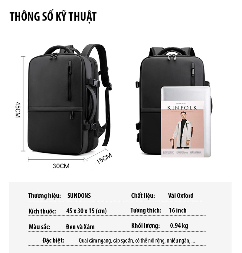 Balo đa năng, Balo du lịch, Balo đựng Macbook, Laptop 16 inch thương hiệu SUNDONS kèm cáp sạc ẩn, có thể nới rộng và quai xách ngang