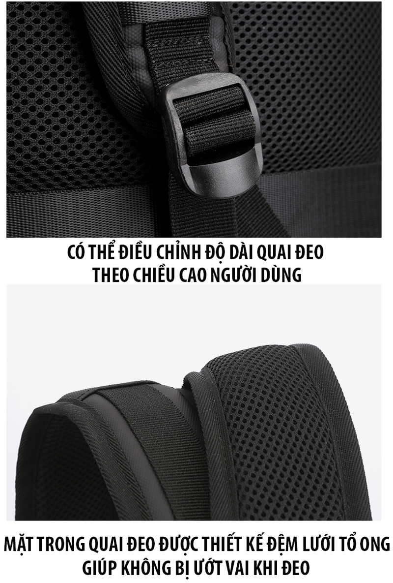Quai đeo và mặt lưng của balo thiết kế đệm lưới tổ ong thoáng khí không gây nóng và ướt ở vai, được may bằng kỹ thuật gấp mép dây viền, được đánh bọ công nghiệp ở vị trí ẩn giúp mang đồ với khối lượng lớn mà không bị đứt quai đeo, thiết kế ôm rất sát hai vai, còn có đai cố định quai đeo không bị rơi xuống khi sử dụng và có thể điều chỉnh nới dài – thu ngắn theo chiều cao người dùng vô cùng linh hoạt.