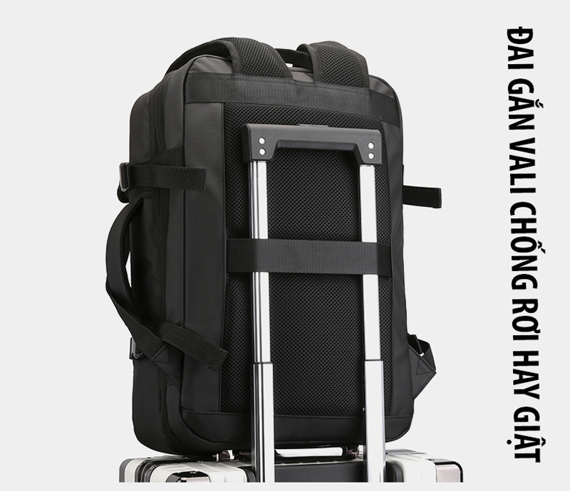 Điểm nổi bật kế tiếp thì phải nói đến đai ngang ở mặt lưng Balo dùng để gắn vào tay cầm của Vali chống rơi rớt, chống giật, ... vô cùng an toàn.