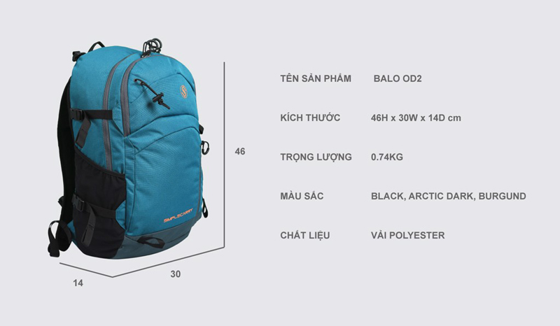 Balo du lịch chính hãng SimpleCarry OD2 có kích thước 46 x 30 x 14 (cm) nhỏ gọn, chỉ 0.74 (kg) mỏng nhẹ, dễ cầm nắm hay mang đi bất cứ đâu mà không bị vướng víu. Nhưng balo lại chứa được trọng tải tối đa 30 (kg) giúp bạn đựng được nhiều đồ vật, đồ cá nhân, ... phù hợp cho những chuyến đi du lịch, đi picnic, đi phượt, đi leo núi, ...