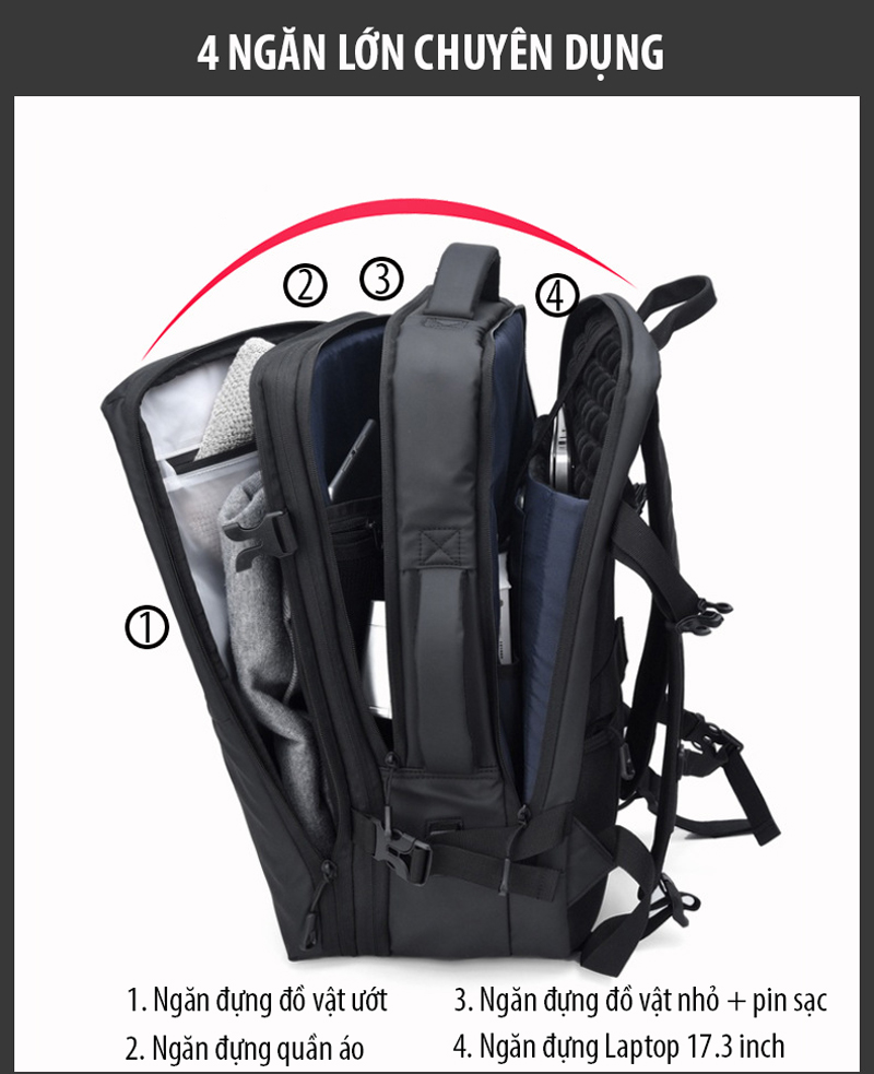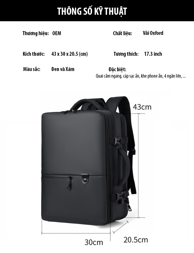 Balo du lịch đa năng đựng được Laptop 17.3 inch giúp mang theo bên mình để làm việc, đi học, ... hay những chuyến đi ngắn ngày bởi thiết kế rất nhiều ngăn, mở ngang như 1 vali, cáp sạc và khe phone ẩn an toàn, đặc biệt là có thể nới rộng/thu lại đến 10cm hỗ trợ mang nhiều đồ vật hơn nhưng lại rất gọn gàng.