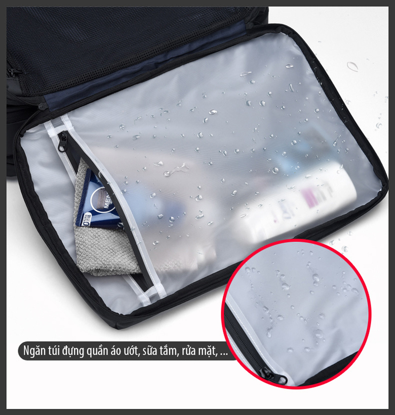 Ngăn trước thiết kế kèm ngăn ẩn có thể nới rộng/thu lại dễ dàng, ngăn ẩn dùng để đựng quần áo có lưới kéo cố định, đối diện là ngăn kính mờ chống thấm nước đựng các đồ vật như bàn chải, quần áo ướt hay mỹ phẩm ống kem, sữa rữa mặt, sữa tắm, dầu gội, ... 1 số vật dụng cá nhân size mini.