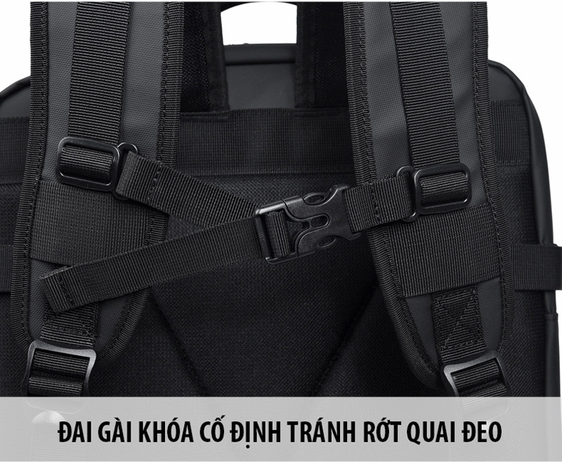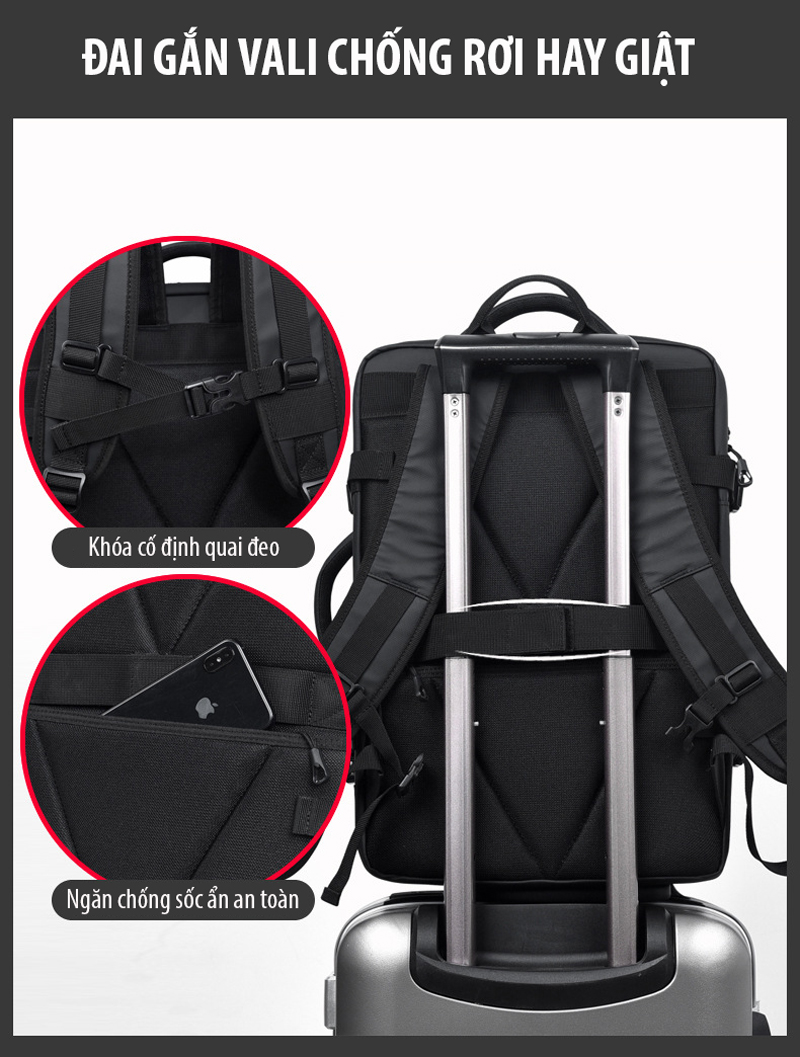 Điểm nổi bật kế tiếp thì phải nói đến đai ngang ở mặt lưng Balo dùng để gắn vào tay cầm của Vali chống rơi rớt, chống giật, ... vô cùng an toàn.