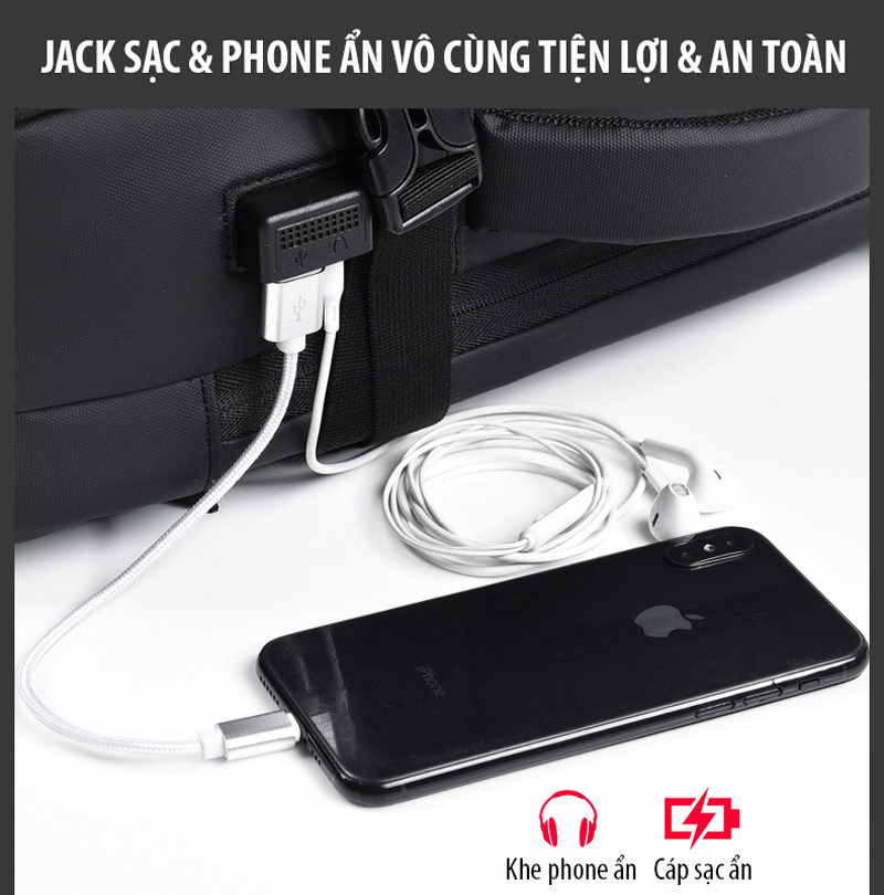 Điểm nổi bật của balo là cáp sạc và khe phone ẩn, bên hông trái của balo có một cổng USB và khe phone giúp bạn có thể để dàng cắm dây sạc điện thoại và phone vào. Tuy nhiên nó chỉ là một cổng USB nối dài, để sạc được thì bạn cần phải có cục sạc dự phòng ở bên trong, tai phone cũng vậy. Cũng cần lưu ý là bạn cần sử dụng loại sạc dự phòng mà cắm USB vào là tự động sạc, chứ loại phải nhấn nút thì phải mở ba lô ra kích hoạt thì mới sử dụng được. Tính năng mới này vô cùng tiện lợi và an toàn cho người sử dụng.