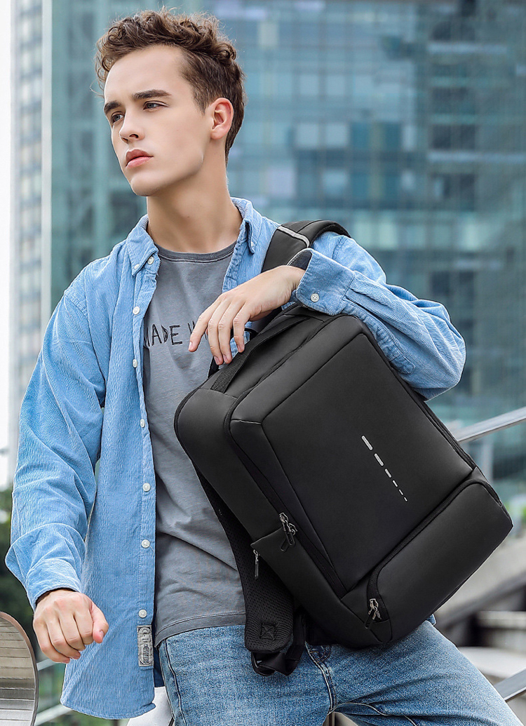 Balo Laptop 16 inch có cấu trúc là hình hộp đứng, ngăn chính được bảo vệ bởi đầu khóa kéo chắc chắn, êm,.. mượt, rất dễ sử dụng gồm 2 ngăn chống sốc lớn nhỏ (ngăn lớn đựng Macbook, Laptop 16 inch trở xuống, ngăn nhỏ có thể đựng iPad, Kindle, ...) được bảo vệ bởi đai gắn cố định giữ thiết bị không bị rơi ra ngoài hay bị lắc qua lại giúp chống sốc tốt nhất. Đối diện là ngăn chuyên dụng dể đựng quần áo, tài liệu, sách vở, ... bởi có đai cố đinh. Đặc biệt, có dây treo chìa khóa tránh rơi hay để lạc mất. Ngoài ra, còn kèm 2 túi lưới phụ đựng điện thoại hay pin sạc dự phòng kết nối với cáp sạc ẩn bên ngoài vô cùng tiện lợi.