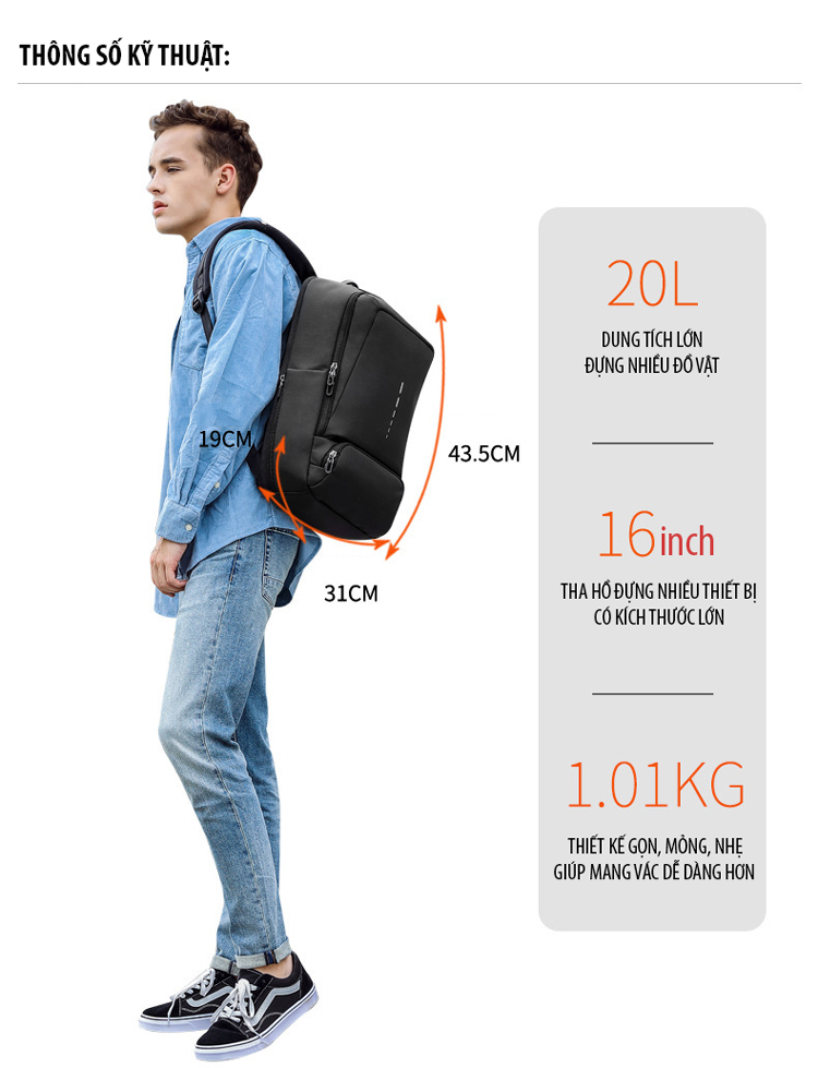 Balo đa năng có kích thước 43.5 x 31 x 19 (cm), mỏng nhẹ 1.01 (kg) chứa được trọng lượng từ 20-35 (L) giúp bạn đựng được nhiều đồ vật, đồ cá nhân, laptop, ... tránh bị quên khi ra ngoài.