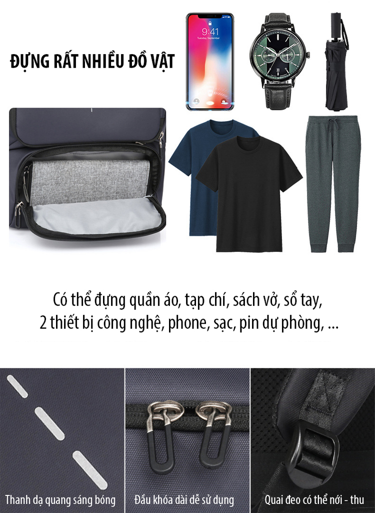 Ngoài ra, ngăn phụ nhỏ phía dưới bạn đựng các vật dụng dễ lấy ra/cất vào như tiền lẻ, thẻ xe, sổ tay, ... Bên hông trái có đầu khóa kéo có thể đựng chai nước hoặc các vật linh tinh như phone, sạc, ô dù, ... Đặc biệt là thanh dạ quang dài đứt khúc ở mặt trước của balo phát sáng vào ban đêm giúp bạn nhận biết balo của mình trong bóng tối.