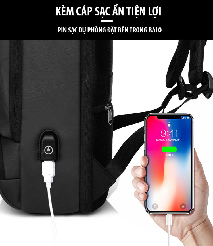 Điểm nổi bật nữa của balo là cáp sạc ẩn, bên hông phải của balo có một cổng USB giúp bạn có thể để dàng cắm dây sạc điện thoại và phone vào. Tuy nhiên nó chỉ là một cổng USB nối dài, để sạc được thì bạn cần phải có cục sạc dự phòng ở bên trong. Cũng cần lưu ý là bạn cần sử dụng loại sạc dự phòng mà cắm USB vào là tự động sạc, chứ loại phải nhấn nút thì phải mở ba lô ra kích hoạt thì mới sử dụng được. Tính năng mới này vô cùng tiện lợi và an toàn cho người sử dụng.
