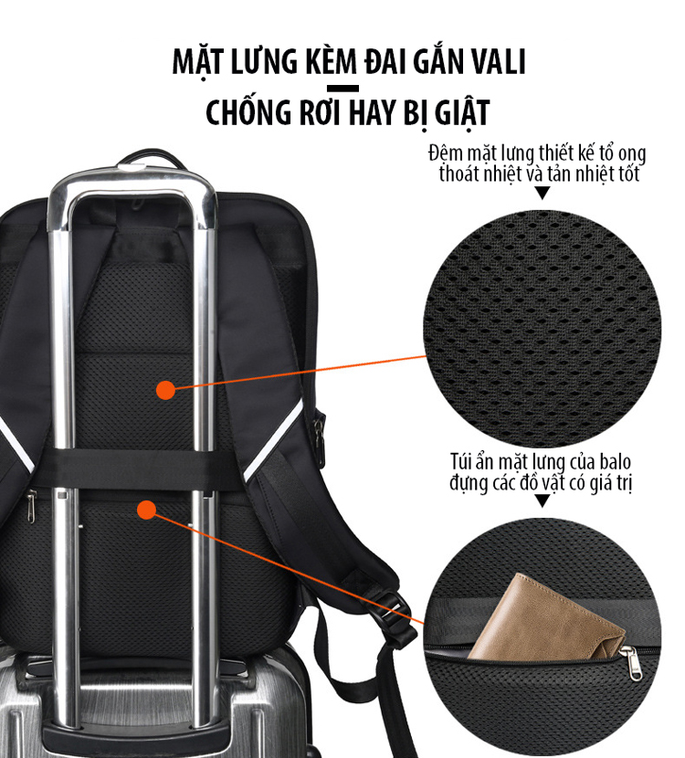 Điểm nổi bật kế tiếp thì phải nói đến đai ngang ở mặt lưng Balo dùng để gắn vào tay cầm của Vali chống rơi rớt, chống giật, ... vô cùng an toàn.