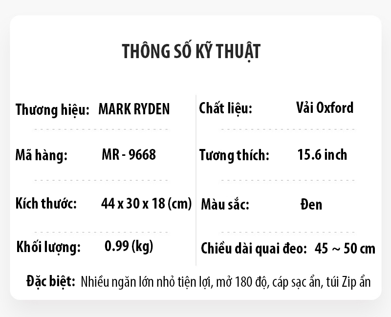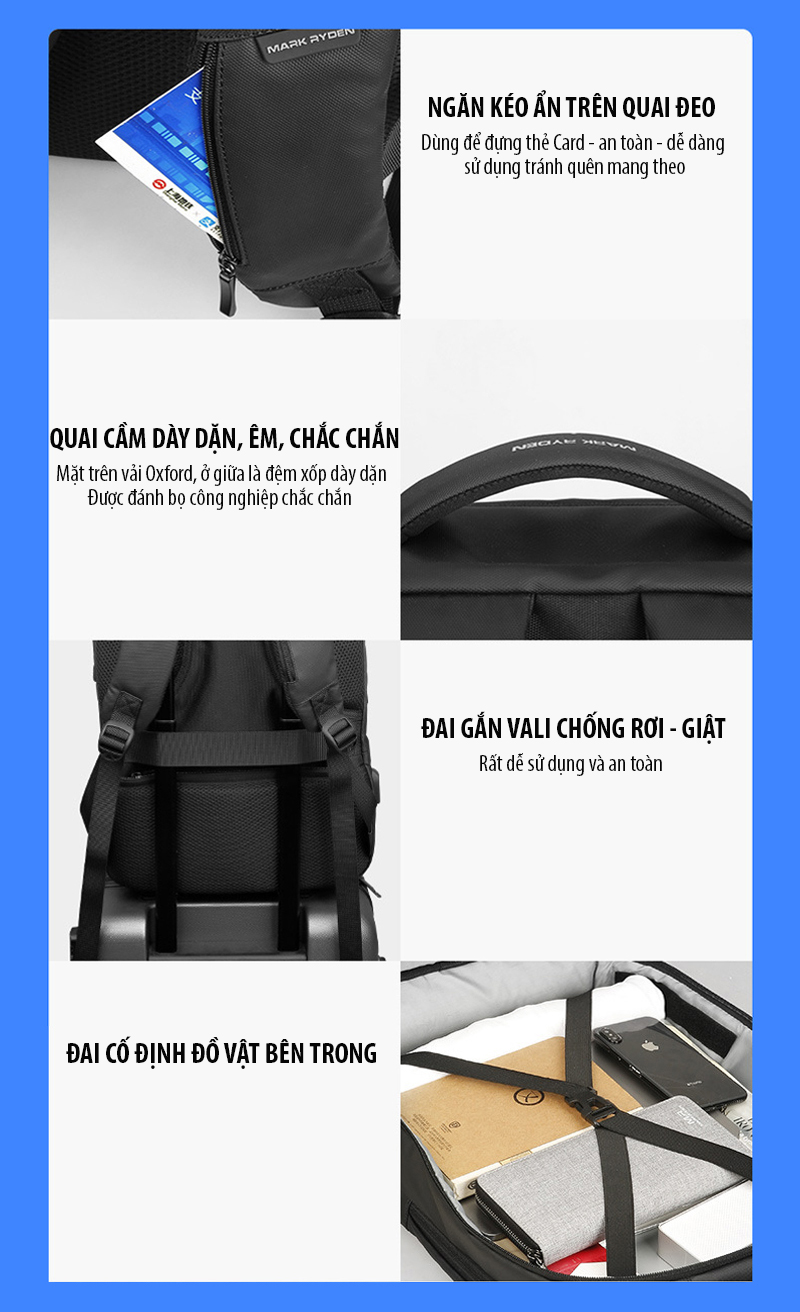 Balo du lịch đa năng của thương hiệu Mark Ryden đến từ Anh Quốc đựng được Laptop 15.6 inch giúp mang theo bên mình để làm việc, đi học, ... hay những chuyến đi ngắn ngày như đi công tác, đi về quê, đi du lịch, đi phượt, ... bởi thiết kế rất nhiều ngăn, mở ngang 180 độ như 1 vali, cáp sạc ẩn an toàn và tiện lợi.