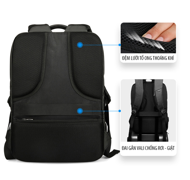 Điểm nổi bật kế tiếp thì phải nói đến đai ngang ở mặt lưng Balo dùng để gắn vào tay cầm của Vali chống rơi rớt, chống giật, ... vô cùng an toàn.