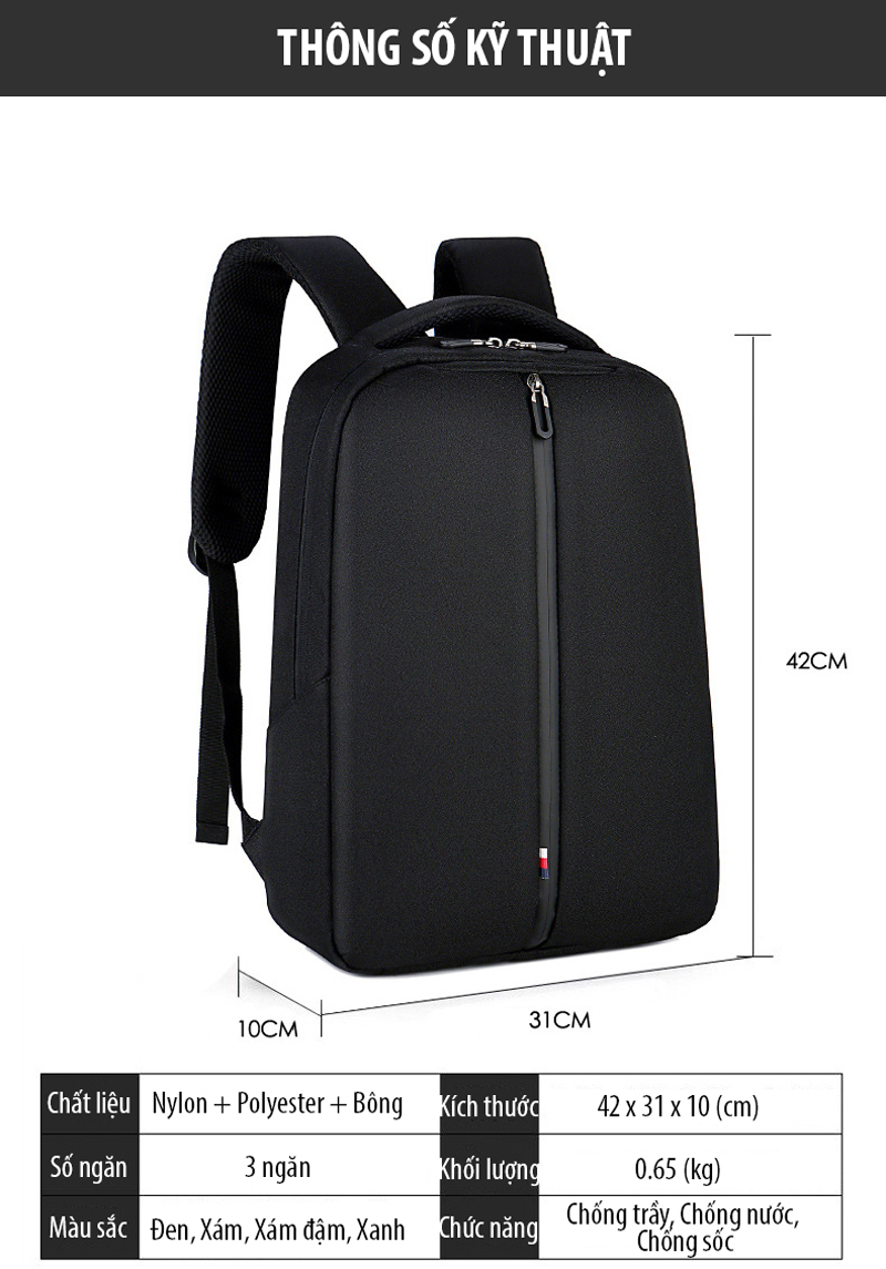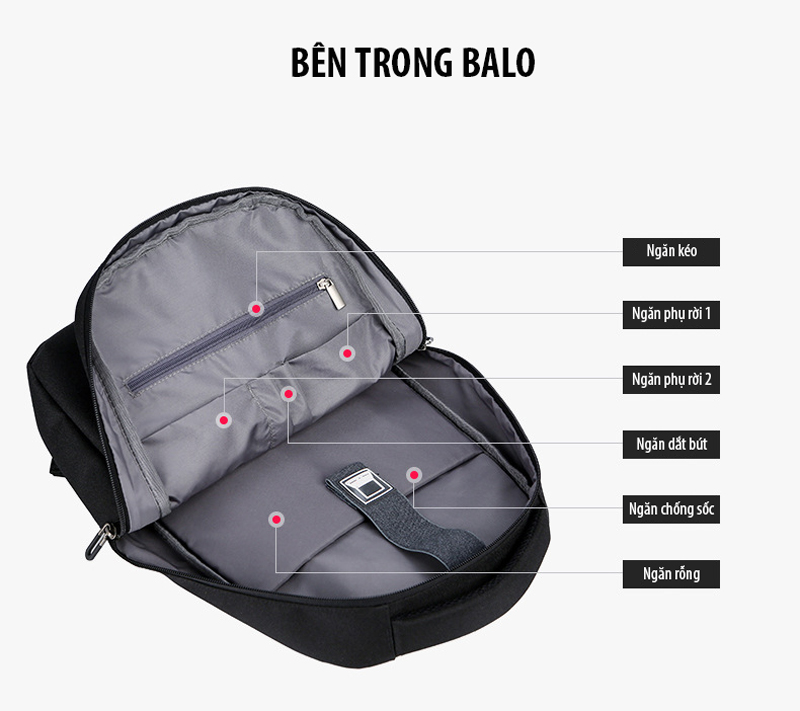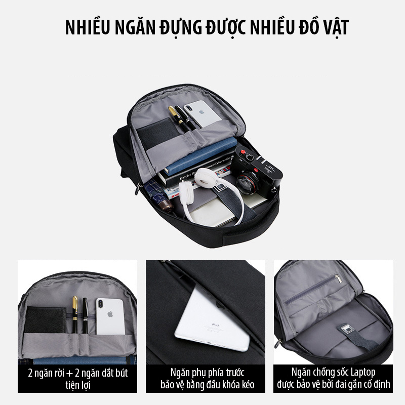 Ngăn chính lớn có 1 ngăn chống sốc đựng Laptop, Macbook,... tối đa 15.6" kèm đai gắn cố định giữ thiết bị không bị rơi ra ngoài hay bị lắc qua lại giúp chống sốc tốt nhất, 2 ngăn phụ rời đựng điện thoại và pin sạc dự phòng, kèm 2 ngăn dắt bút và ngăn trống đựng tài liệu, sách vở,... đặc biệt là ngăn phụ riêng biệt phía trước được bảo vệ bởi đầu khóa kéo và còn làm điểm nhấn đẹp cho balo.