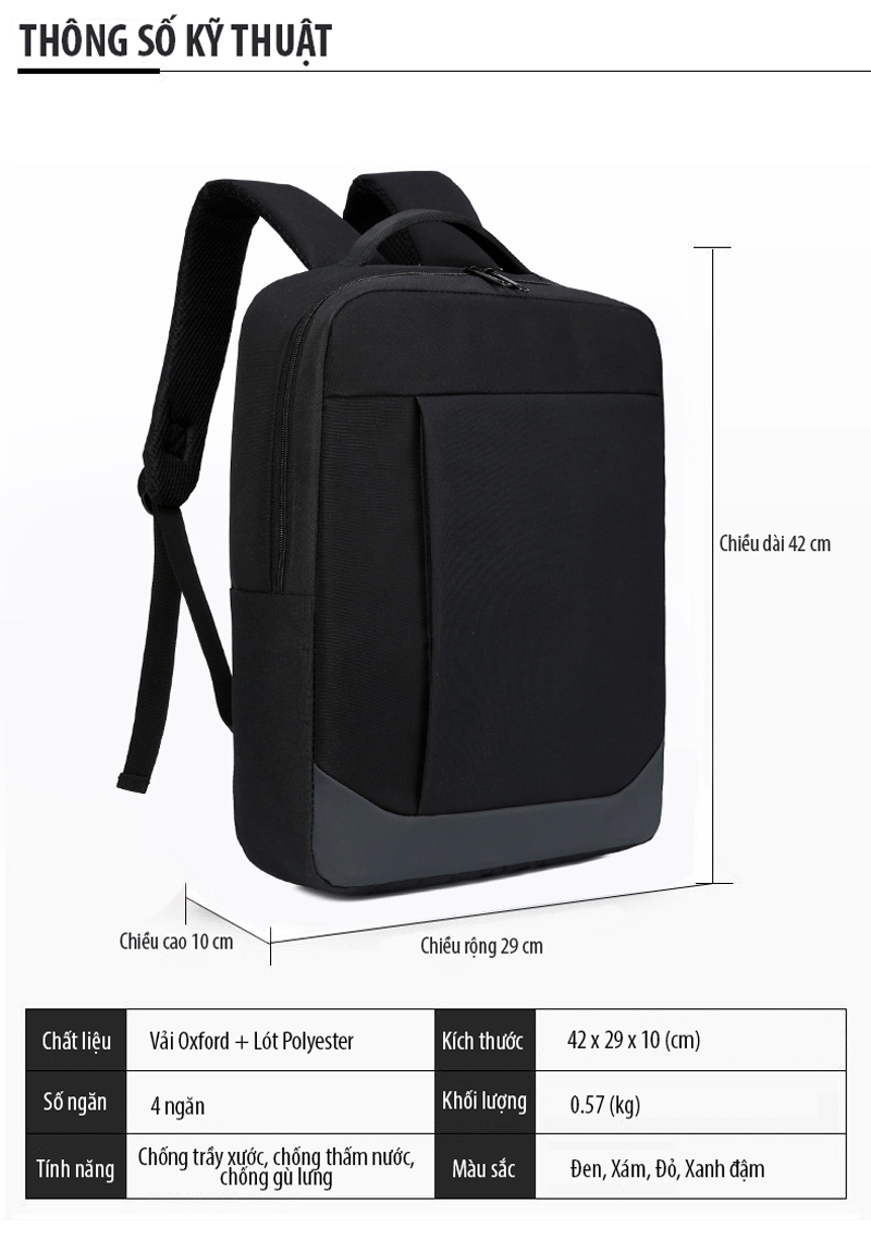 Balo đựng Macbook 16 inch có kích thước 42 x 29 x 10 (cm) nhỏ gọn, chỉ 0.57 (kg) mỏng nhẹ, vừa tầm tay dễ cầm nắm hay mang đi bất cứ đâu mà không bị vướng víu. Nhưng balo lại chứa được trọng tải tối đa 20 (L) giúp bạn đựng được nhiều đồ vật, đồ cá nhân, laptop, ... tránh bị quên khi ra ngoài.