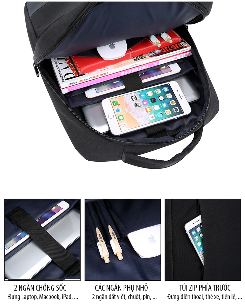 Ngăn chính lớn có 2 ngăn chống sốc: ngăn lớn đựng Laptop, Macbook, ..., ngăn nhỏ đựng iPad, Kindle, Notebook, ... kèm đai gắn cố định giữ thiết bị không bị rơi ra ngoài mang lại hiệu quả chống sốc tốt nhất. Ngoài ra, balo còn nhiều ngăn nhỏ hơn như ngăn kéo đựng ví, 2 ngăn phụ rơi đựng điện thoại và pin sạc dự phòng, có 2 ngăn dắt bút và ngăn trống đựng tài liệu, sách vở, ... Túi Zip phía trước đựng điện thoại, thẻ xe, tiền lẻ, ...
