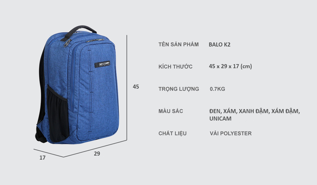 Balo Laptop 14 inch thương hiệu SimpleCarry K2 có kích thước 45 x 29 x 17 (cm) nhỏ gọn, chỉ 0.7 (kg) mỏng nhẹ, vừa tầm tay dễ cầm nắm hay mang đi bất cứ đâu mà không bị vướng víu. Nhưng balo lại chứa được trọng tải tối đa 25 (kg) giúp bạn đựng được nhiều đồ vật, đồ cá nhân, laptop, ... tránh bị quên khi ra ngoài.