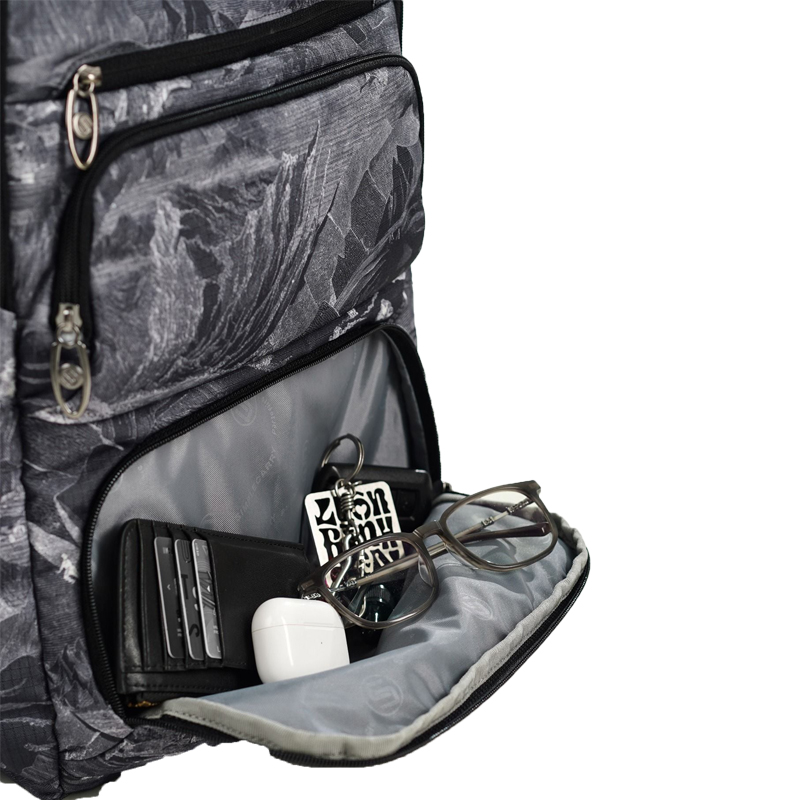 Balo có 4 ngăn phụ phía trước và 2 ngăn bên hông được bảo vệ bằng đầu khóa kéo đựng sổ tay, điện thoại, bút, ví, thẻ xe, ô dù, chai nước, chìa khóa, tai nghe, cáp sạc, adapter, namecard, thẻ card, ... dễ dàng lấy ra/cất vào.
