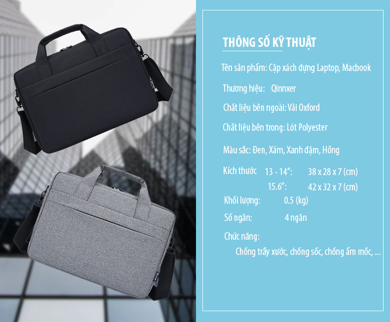 Cặp xách Laptop 13 - 14 inch thương hiệu Qinnxer cao cấp, chống sốc tốt để bảo vệ Laptop, Macbook, iPad, Tablet, Notebook, Kindle ... thiết kế kèm ngăn phụ phía trước để đựng nhiều đồ vật hơn, còn kèm quai xách có thể tháo/lắp để sử dụng như cặp xách hay túi xách.