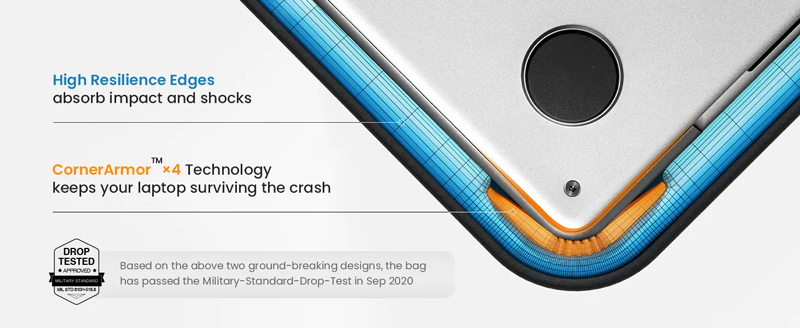 Chống va đập chuẩn quân đội: Không ngại rơi rớt, va đập hay rung động! Túi chống sốc tomtoc trang bị công nghệ CornerArmor độc quyền, viền siêu đàn hồi và lớp đệm dày, đạt chuẩn chống rơi quân đội (Military-Standard-Drop-Test) nhưng vẫn giữ thiết kế mỏng nhẹ.