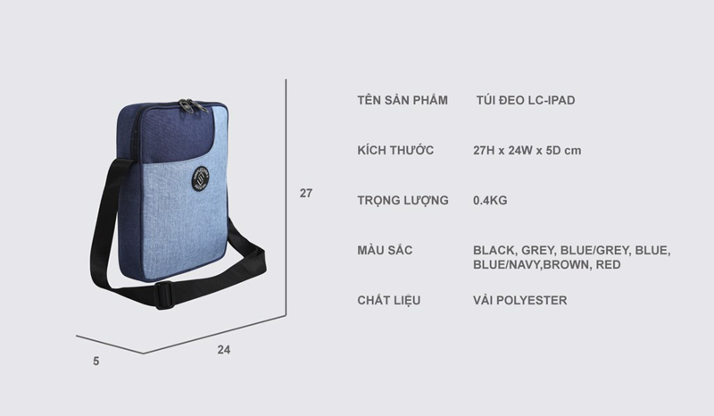 Túi đeo đựng iPad LC IPAD có kích thước 27 x 24 x 5 (cm), mỏng nhẹ 0.4 (kg) giúp bạn đựng được nhiều đồ vật như đồ cá nhân, phụ kiện điện tử, ... chứa được nhiều thiết bị tránh bị quên khi ra ngoài.