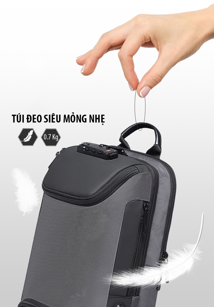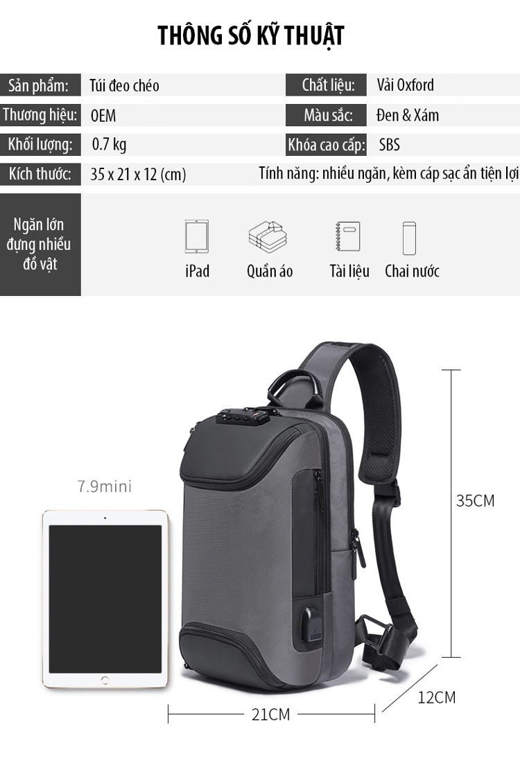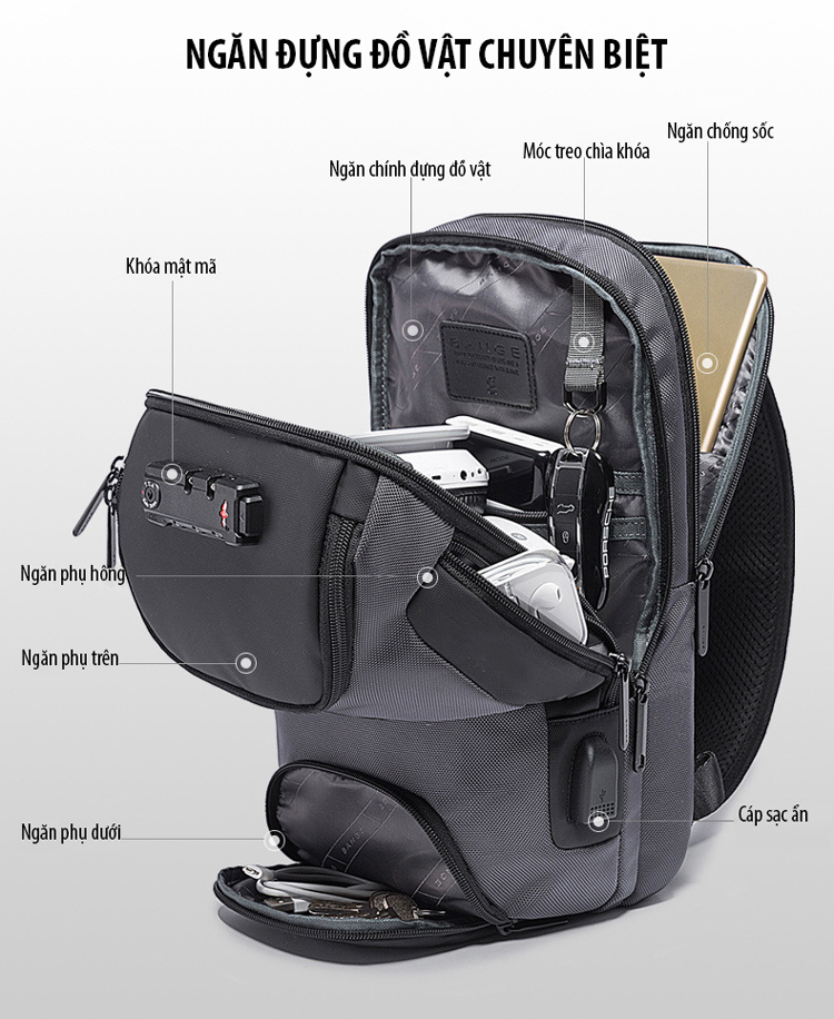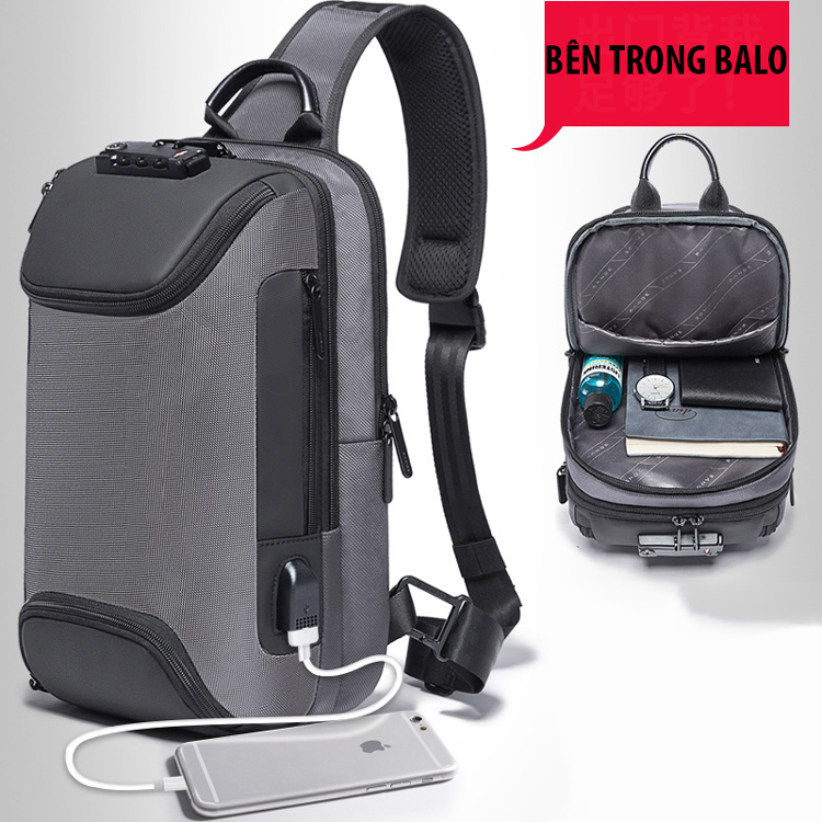 Túi đeo chéo thể thao thương hiệu BANGE nhiều ngăn đựng iPad, khóa mật mã kèm cáp sạc ẩn cao cấp