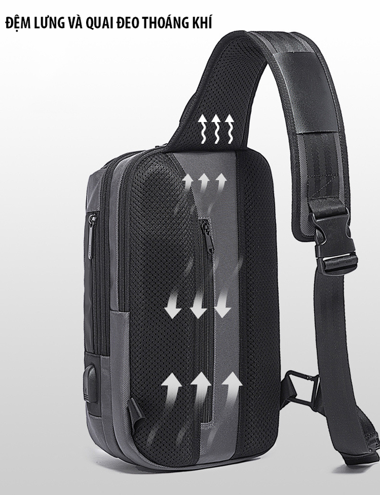 Quai đeo và mặt lưng của túi đeo chéo thiết kế đệm lưới tổ ong dày dặn thoáng khí không gây nóng và ướt ở vai, được may bằng kỹ thuật gấp mép dây viền, thiết kế ôm rất sát vai và có thể điều chỉnh nới dài – thu ngắn theo chiều cao người dùng vô cùng linh hoạt. Ngoài ra, mặt lưng có ngăn ẩn dùng để đựng ví, điện thoại hay những đồ vật có giá trị lớn tránh bị móc túi.