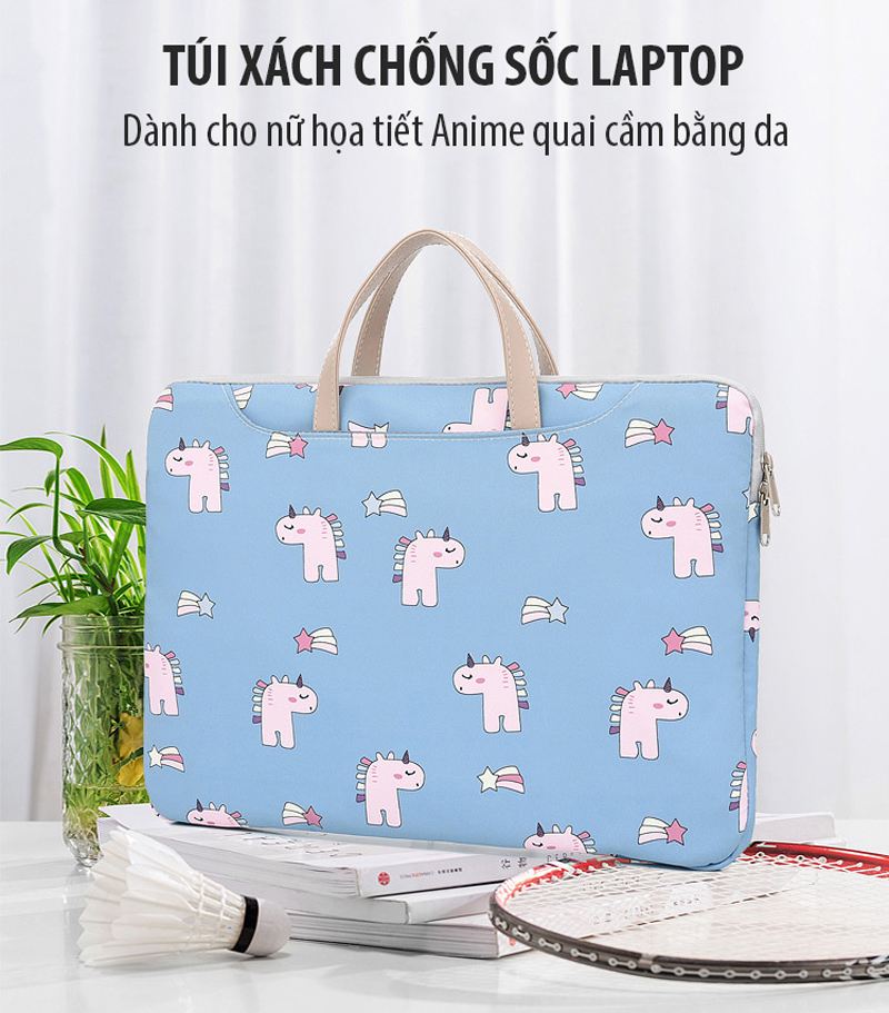Túi xách chống sốc Macbook, Laptop 13, 14, 15.6 inch dành cho nữ họa tiết Anime quai cầm bằng da